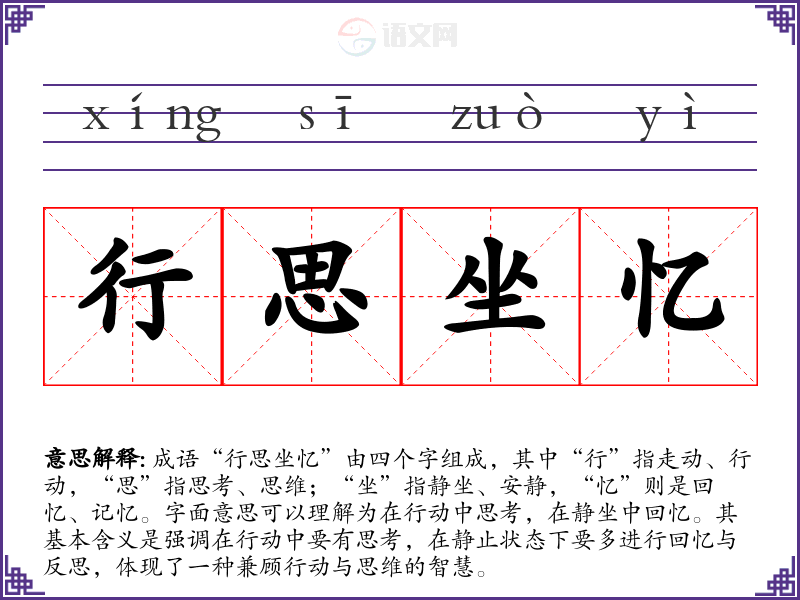 成语“行思坐忆”由四个字组成,其中“行”指走动、行动,“思”指思考、思维;“坐”指静坐、安静,“忆”则是回忆、记忆。字面意思可以理解为在行动中思考,在静坐中回忆。其基本含义是强调在行动中要有思考,在静止状态下要多进行回忆与反思,体现了一种兼顾行动与思维的智慧。