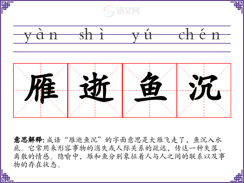成语“雁逝鱼沉”的字面意思是大雁飞走了,鱼沉入水底。它常用来形容事物的消失或人际关系的疏远,传达一种失落、离散的情感。隐喻中,雁和鱼分别象征着人与人之间的联系以及事物的存在状态。