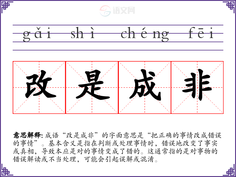 成语“改是成非”的字面意思是“把正确的事情改成错误的事情”。基本含义是指在判断或处理事情时,错误地改变了事实或真相,导致本应是对的事情变成了错的。这通常指的是对事物的错误解读或不当处理,可能会引起误解或混淆。