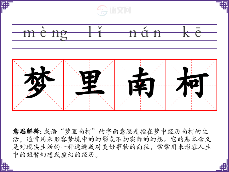 成语“梦里南柯”的字面意思是指在梦中经历南柯的生活,通常用来形容梦境中的幻影或不切实际的幻想。它的基本含义是对现实生活的一种逃避或对美好事物的向往,常常用来形容人生中的短暂幻想或虚幻的经历。