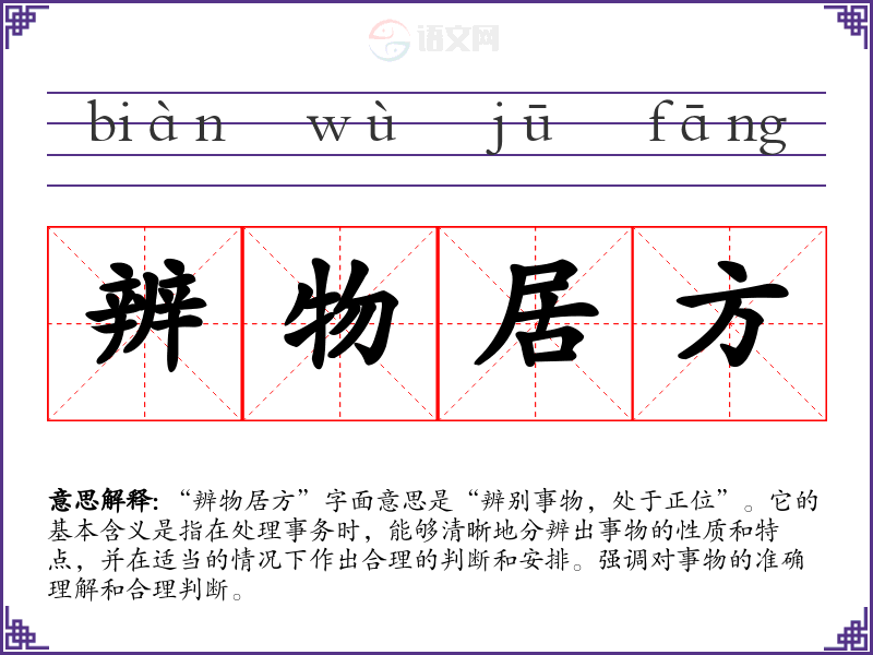 “辨物居方”字面意思是“辨别事物,处于正位”。它的基本含义是指在处理事务时,能够清晰地分辨出事物的性质和特点,并在适当的情况下作出合理的判断和安排。强调对事物的准确理解和合理判断。