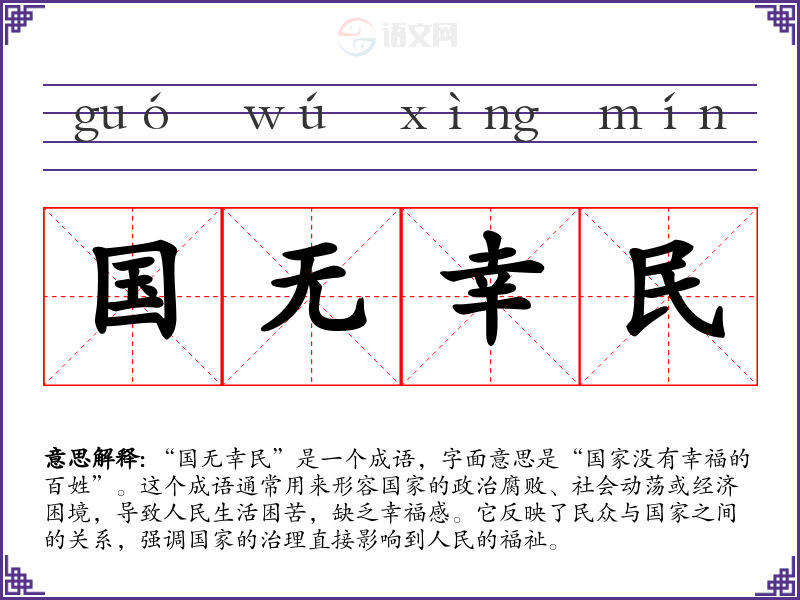 “国无幸民”是一个成语,字面意思是“国家没有幸福的百姓”。这个成语通常用来形容国家的政治腐败、社会动荡或经济困境,导致人民生活困苦,缺乏幸福感。它反映了民众与国家之间的关系,强调国家的治理直接影响到人民的福祉。