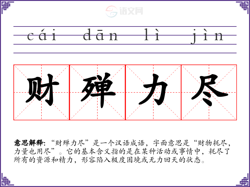 “财殚力尽”是一个汉语成语,字面意思是“财物耗尽,力量也用尽”。它的基本含义指的是在某种活动或事情中,耗尽了所有的资源和精力,形容陷入极度困境或无力回天的状态。