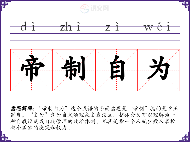 “帝制自为”这个成语的字面意思是“帝制”指的是帝王制度,“自为”意为自我治理或自我设立。整体含义可以理解为一种自我设定或自我管理的政治体制,尤其是指一个人或少数人掌控整个国家的决策和权力。