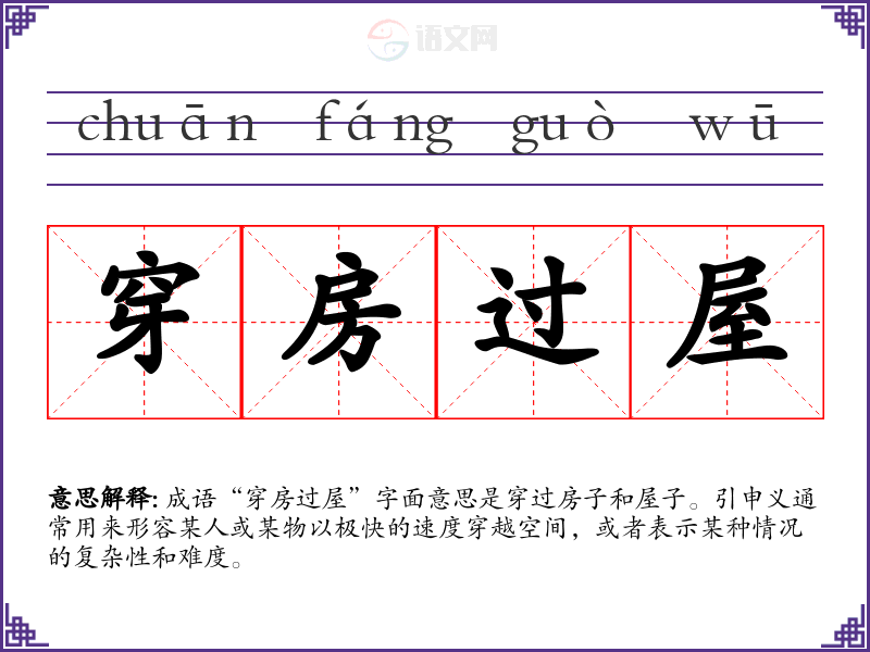 成语“穿房过屋”字面意思是穿过房子和屋子。引申义通常用来形容某人或某物以极快的速度穿越空间,或者表示某种情况的复杂性和难度。