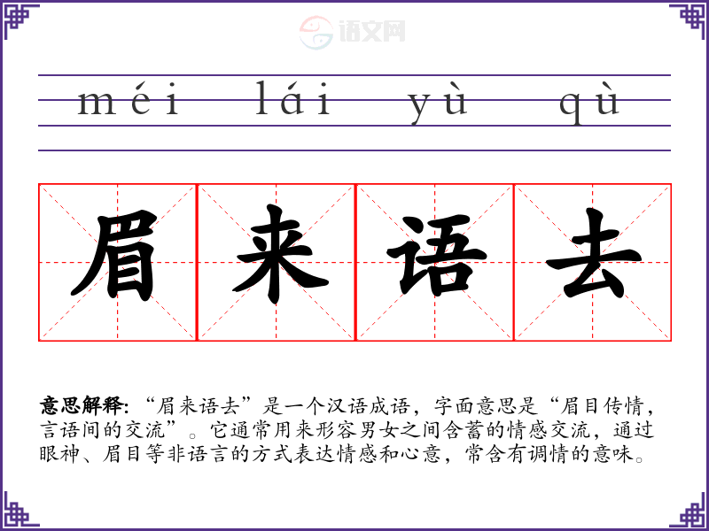 “眉来语去”是一个汉语成语,字面意思是“眉目传情,言语间的交流”。它通常用来形容男女之间含蓄的情感交流,通过眼神、眉目等非语言的方式表达情感和心意,常含有调情的意味。