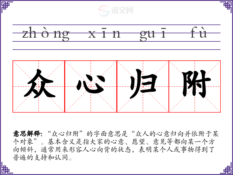通过对“众心归附”的学,我更加理解了人际关系和团队合作的重要性。这不仅是语言学的过程,更是对社会和人性的深刻理解。这个成语在表达团结、合作和共同目标时具有重要意义,值得我们在日常交流中加以运用。