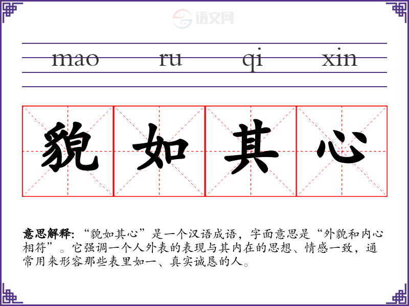 “貌如其心”是一个汉语成语,字面意思是“外貌和内心相符”。它强调一个人外表的表现与其内在的思想、情感一致,通常用来形容那些表里如一、真实诚恳的人。