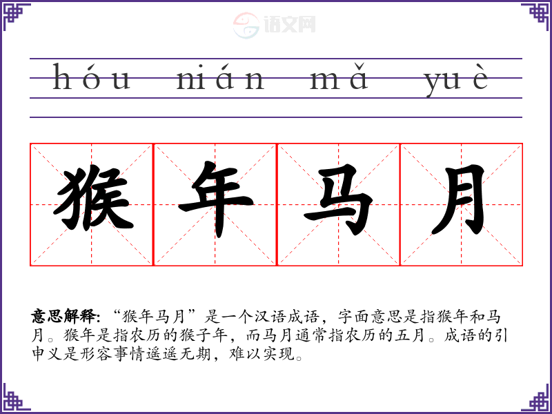 “猴年马月”是一个汉语成语,字面意思是指猴年和马月。猴年是指农历的猴子年,而马月通常指农历的五月。成语的引申义是形容事情遥遥无期,难以实现。