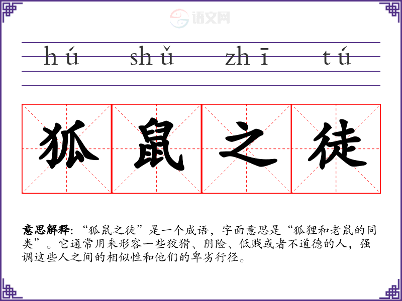 该成语的具体来源并不十分明确,但可以追溯到古代文献中对狐狸和老鼠的描写。狐狸常被视为狡猾的象征,而老鼠则常常被认为是偷窃和卑鄙的动物。因此,将二者放在一起,形成“狐鼠之徒”,便生动地描绘出一群不值得信任的人。