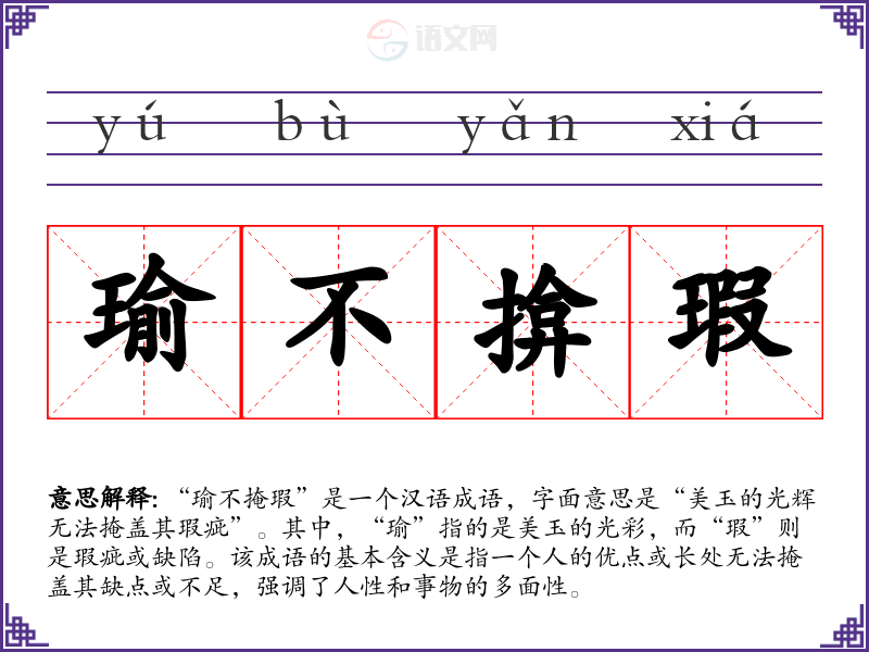 “瑜不掩瑕”是一个汉语成语,字面意思是“美玉的光辉无法掩盖其瑕疵”。其中,“瑜”指的是美玉的光彩,而“瑕”则是瑕疵或缺陷。该成语的基本含义是指一个人的优点或长处无法掩盖其缺点或不足,强调了人性和事物的多面性。