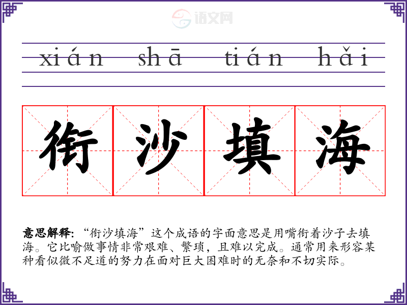 “衔沙填海”这个成语的字面意思是用嘴衔着沙子去填海。它比喻做事情非常艰难、繁琐,且难以完成。通常用来形容某种看似微不足道的努力在面对巨大困难时的无奈和不切实际。