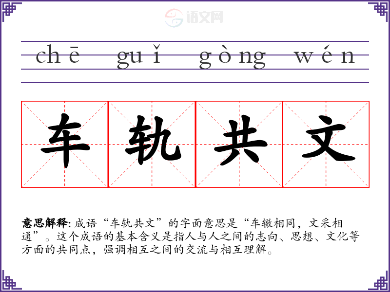 成语“车轨共文”的字面意思是“车辙相同,文采相通”。这个成语的基本含义是指人与人之间的志向、思想、文化等方面的共同点,强调相互之间的交流与相互理解。