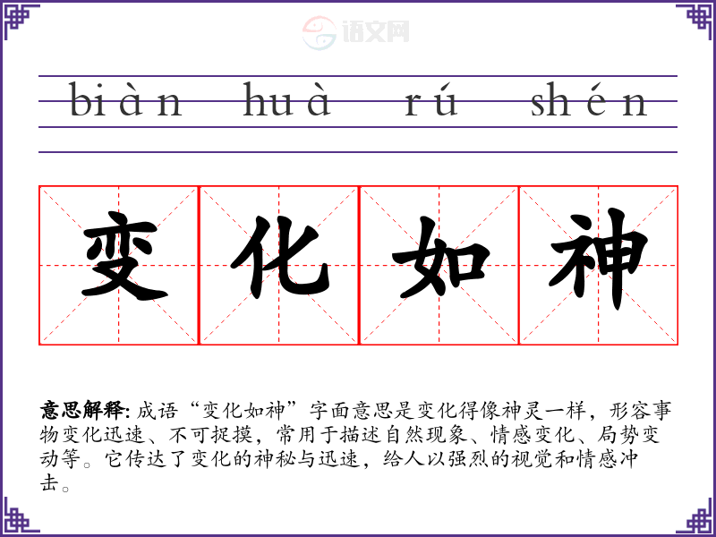 - 反义成语:一成不变、循规蹈矩。与“变化如神”相对,它们强调的是稳定与不变,显示出事物发展过程中的对比。