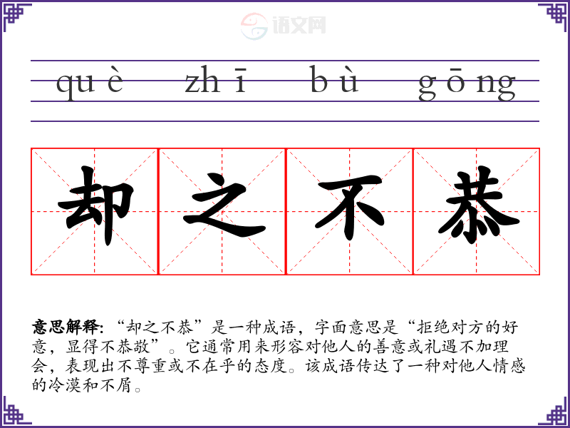 “却之不恭”是一种成语,字面意思是“拒绝对方的好意,显得不恭敬”。它通常用来形容对他人的善意或礼遇不加理会,表现出不尊重或不在乎的态度。该成语传达了一种对他人情感的冷漠和不屑。