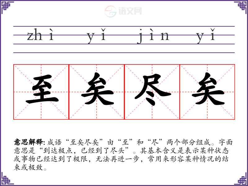 成语“至矣尽矣”由“至”和“尽”两个部分组成。字面意思是“到达极点,已经到了尽头”。其基本含义是表示某种状态或事物已经达到了极限,无法再进一步,常用来形容某种情况的结束或极致。