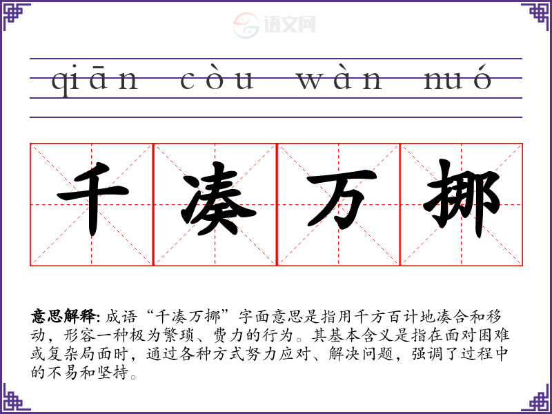 成语“千凑万挪”字面意思是指用千方百计地凑合和移动,形容一种极为繁琐、费力的行为。其基本含义是指在面对困难或复杂局面时,通过各种方式努力应对、解决问题,强调了过程中的不易和坚持。