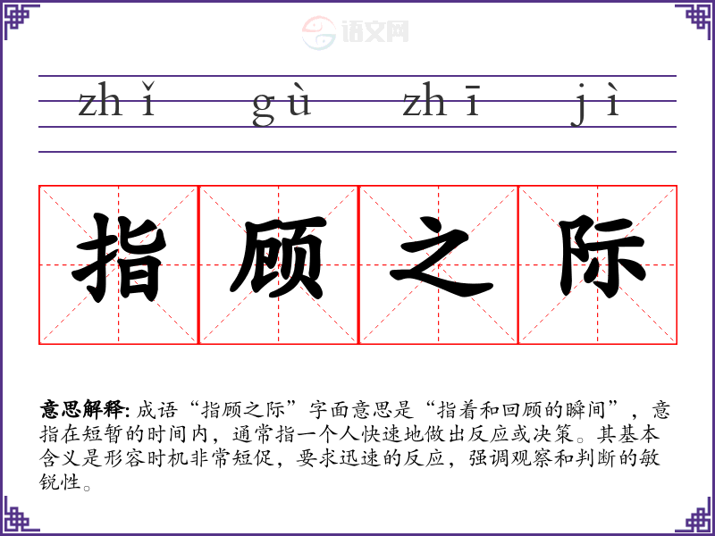 成语“指顾之际”字面意思是“指着和回顾的瞬间”,意指在短暂的时间内,通常指一个人快速地做出反应或决策。其基本含义是形容时机非常短促,要求迅速的反应,强调观察和判断的敏锐性。