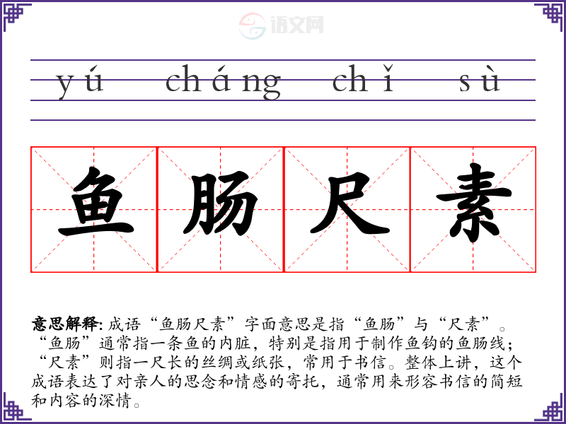 成语“鱼肠尺素”字面意思是指“鱼肠”与“尺素”。“鱼肠”通常指一条鱼的内脏,特别是指用于制作鱼钩的鱼肠线;“尺素”则指一尺长的丝绸或纸张,常用于书信。整体上讲,这个成语表达了对亲人的思念和情感的寄托,通常用来形容书信的简短和内容的深情。