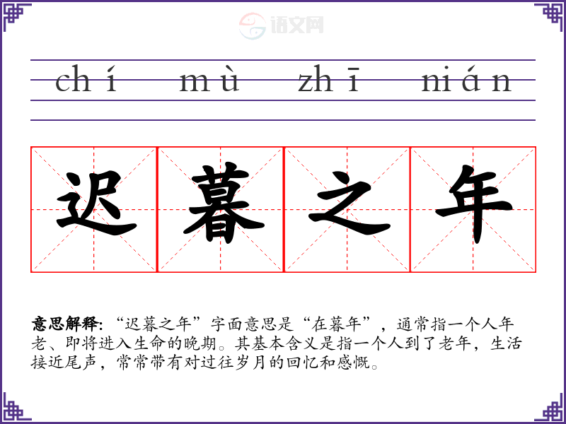 “迟暮之年”字面意思是“在暮年”,通常指一个人年老、即将进入生命的晚期。其基本含义是指一个人到了老年,生活接近尾声,常常带有对过往岁月的回忆和感慨。