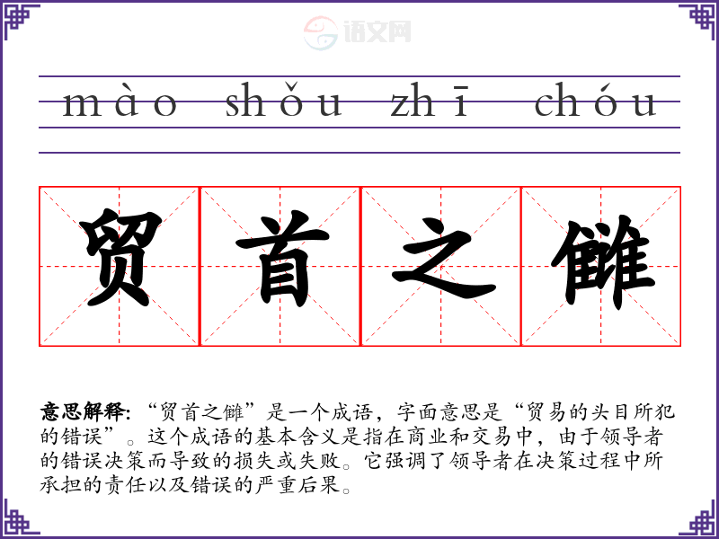 “贸首之雠”是一个成语,字面意思是“贸易的头目所犯的错误”。这个成语的基本含义是指在商业和交易中,由于领导者的错误决策而导致的损失或失败。它强调了领导者在决策过程中所承担的责任以及错误的严重后果。