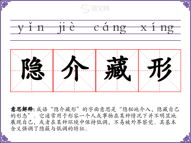 “隐介藏形”并没有明确的历史典故或文学出处,它可能是由多个汉字组合而成,反映了古代汉语中对隐秘和低调的重视。在中国传统文化中,隐忍与低调被视为一种美德,强调不张扬、不炫耀的处世态度。