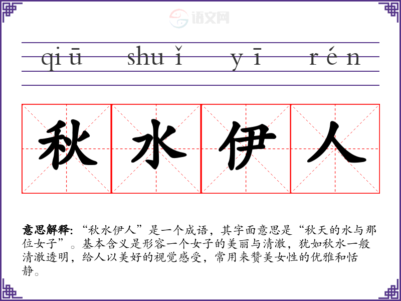 “秋水伊人”是一个成语,其字面意思是“秋天的水与那位女子”。基本含义是形容一个女子的美丽与清澈,犹如秋水一般清澈透明,给人以美好的视觉感受,常用来赞美女性的优雅和恬静。