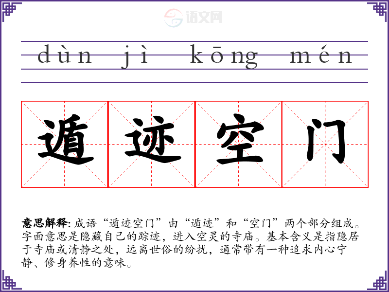 成语“遁迹空门”由“遁迹”和“空门”两个部分组成。字面意思是隐藏自己的踪迹,进入空灵的寺庙。基本含义是指隐居于寺庙或清静之处,远离世俗的纷扰,通常带有一种追求内心宁静、修身养性的意味。
