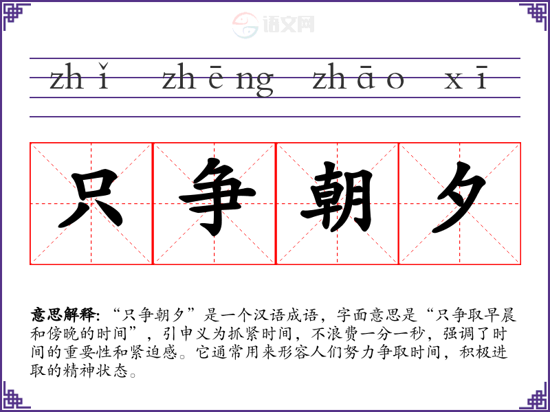 “只争朝夕”是一个汉语成语,字面意思是“只争取早晨和傍晚的时间”,引申义为抓紧时间,不浪费一分一秒,强调了时间的重要性和紧迫感。它通常用来形容人们努力争取时间,积极进取的精神状态。