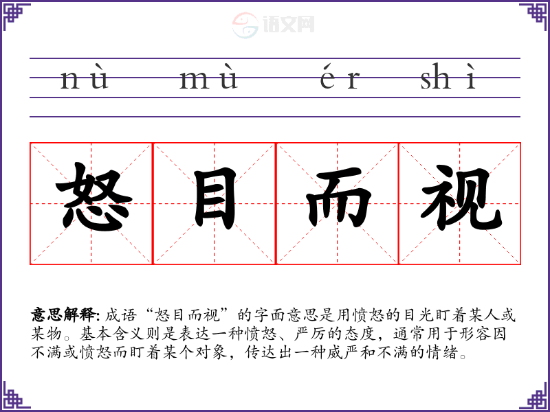 成语“怒目而视”的字面意思是用愤怒的目光盯着某人或某物。基本含义则是表达一种愤怒、严厉的态度,通常用于形容因不满或愤怒而盯着某个对象,传达出一种威严和不满的情绪。