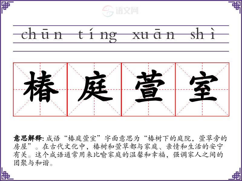 “椿庭萱室”的起源与古代**的传统文化密切相关。椿树在古文中常被视为长寿的象征,而萱草则被称为“忘忧草”,意指忘却烦恼,象征着家庭的安乐与幸福。成语可能源自于古代文人的诗句或散文中,表达对美好家庭生活的向往。