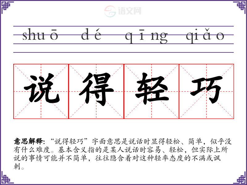 “说得轻巧”字面意思是说话时显得轻松、简单,似乎没有什么难度。基本含义指的是某人说话时容易、轻松,但实际上所说的事情可能并不简单,往往隐含着对这种轻率态度的不满或讽刺。