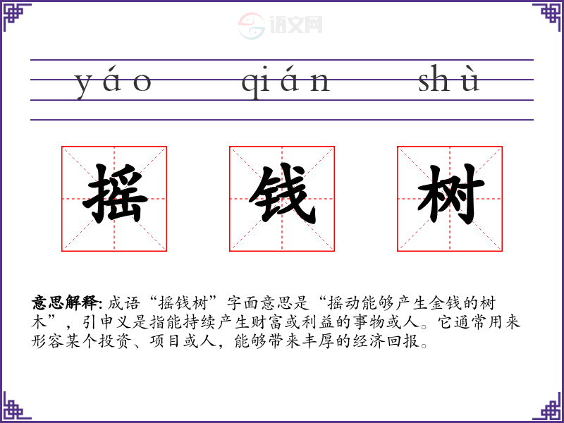 成语“摇钱树”字面意思是“摇动能够产生金钱的树木”,引申义是指能持续产生财富或利益的事物或人。它通常用来形容某个投资、项目或人,能够带来丰厚的经济回报。