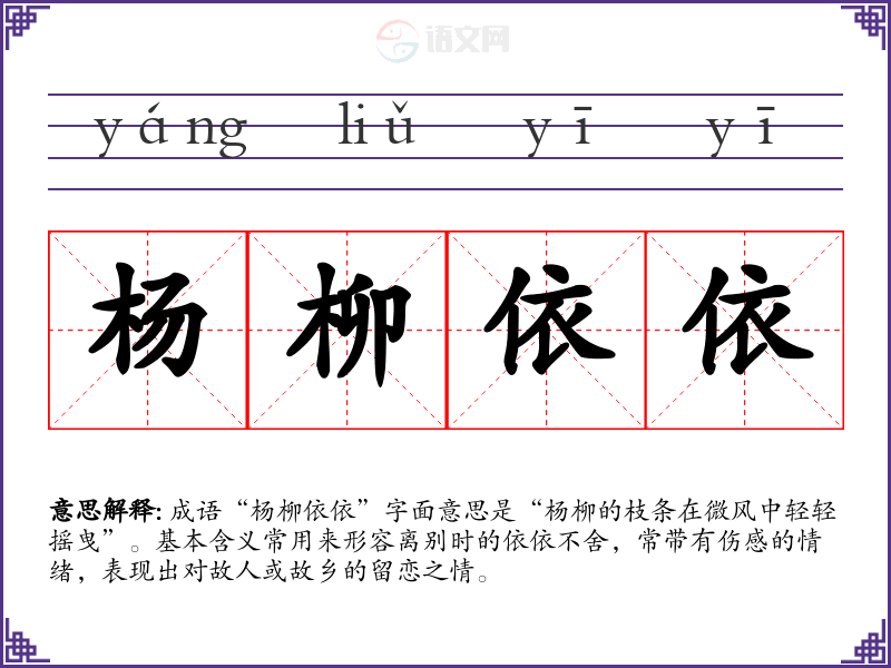 成语“杨柳依依”字面意思是“杨柳的枝条在微风中轻轻摇曳”。基本含义常用来形容离别时的依依不舍,常带有伤感的情绪,表现出对故人或故乡的留恋之情。