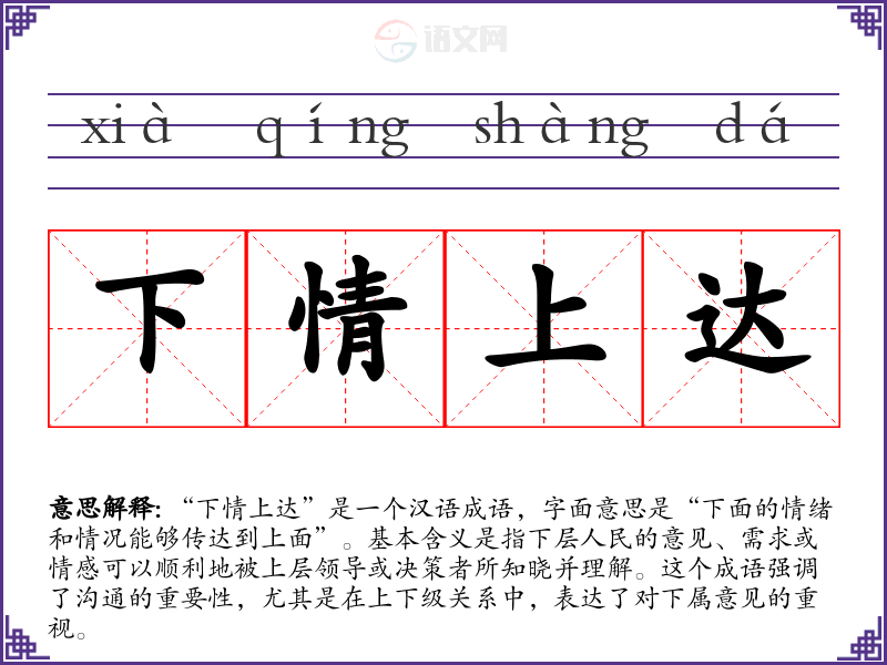 “下情上达”给人一种积极的情感反应,体现了对沟通与理解的重视。它让我联想到在工作或生活中,良好的沟通能够促进理解和合作。这个成语也提醒我,在与他人交流时,倾听和反馈是多么的重要。