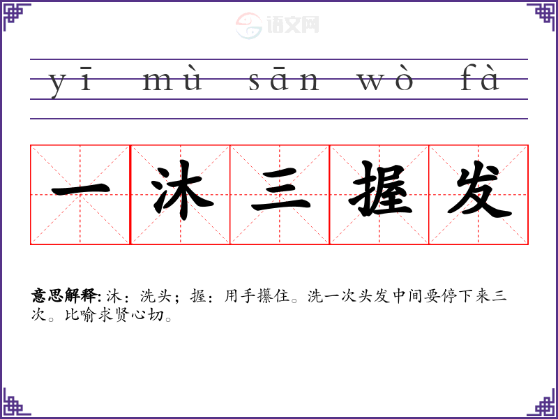 沐:洗头;握:用手攥住。洗一次头发中间要停下来三次。比喻求贤心切。
