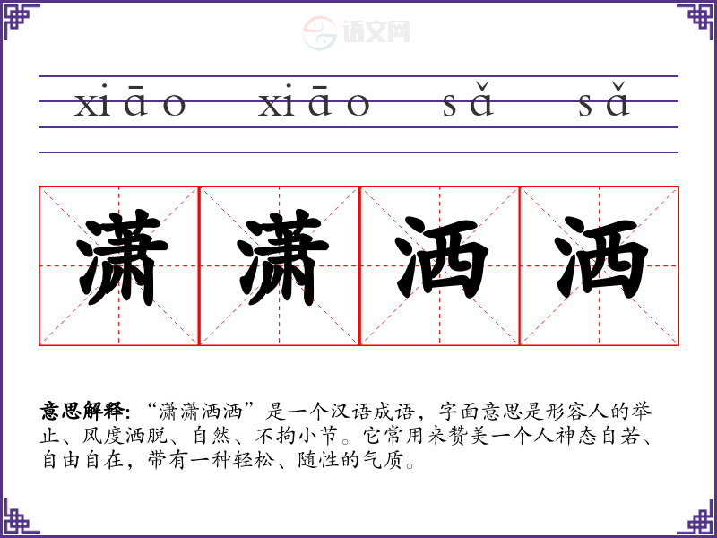 “潇潇洒洒”是一个汉语成语,字面意思是形容人的举止、风度洒脱、自然、不拘小节。它常用来赞美一个人神态自若、自由自在,带有一种轻松、随性的气质。