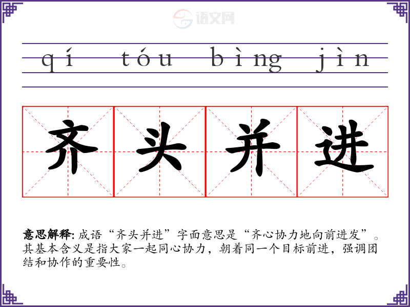 成语“齐头并进”字面意思是“齐心协力地向前进发”。其基本含义是指大家一起同心协力,朝着同一个目标前进,强调团结和协作的重要性。