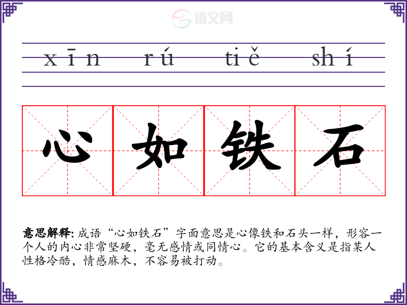 成语“心如铁石”字面意思是心像铁和石头一样,形容一个人的内心非常坚硬,毫无感情或同情心。它的基本含义是指某人性格冷酷,情感麻木,不容易被打动。