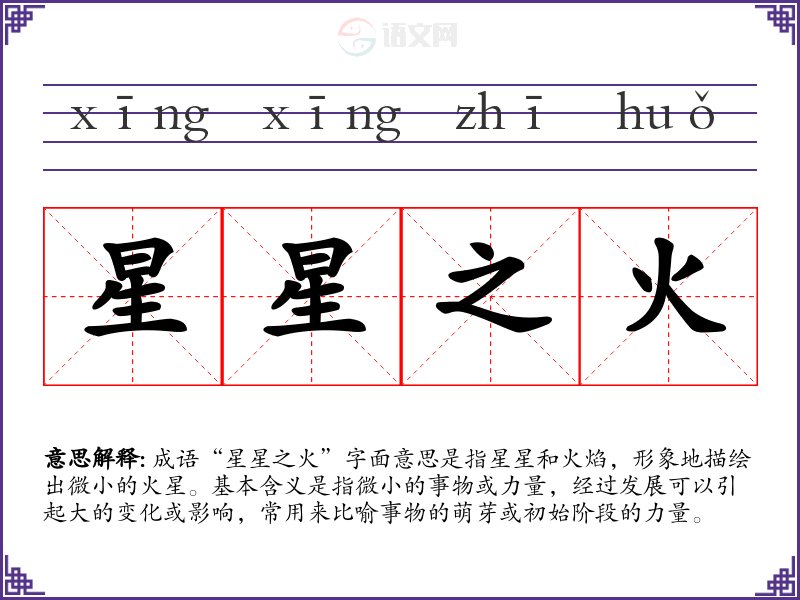 成语“星星之火”字面意思是指星星和火焰,形象地描绘出微小的火星。基本含义是指微小的事物或力量,经过发展可以引起大的变化或影响,常用来比喻事物的萌芽或初始阶段的力量。