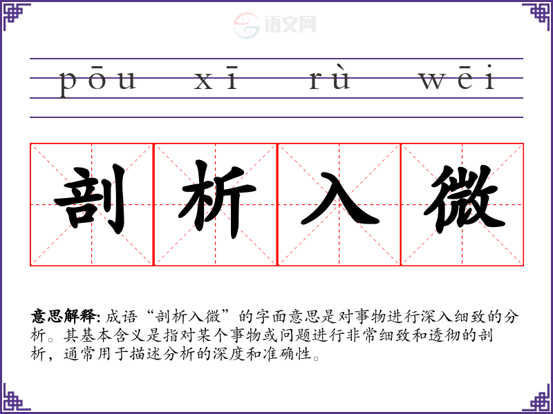 成语“剖析入微”的字面意思是对事物进行深入细致的分析。其基本含义是指对某个事物或问题进行非常细致和透彻的剖析,通常用于描述分析的深度和准确性。