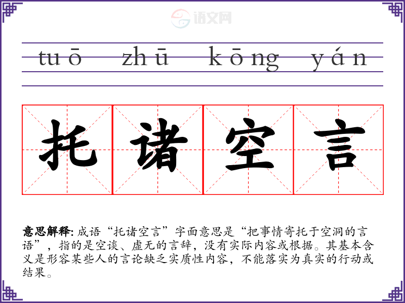 成语“托诸空言”字面意思是“把事情寄托于空洞的言语”,指的是空谈、虚无的言辞,没有实际内容或根据。其基本含义是形容某些人的言论缺乏实质性内容,不能落实为真实的行动或结果。