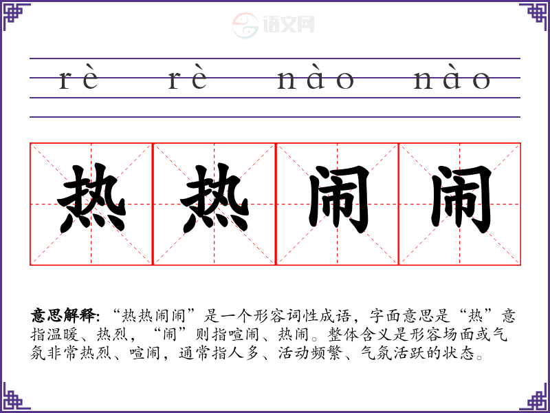 “热热闹闹”是一个形容词性成语,字面意思是“热”意指温暖、热烈,“闹”则指喧闹、热闹。整体含义是形容场面或气氛非常热烈、喧闹,通常指人多、活动频繁、气氛活跃的状态。