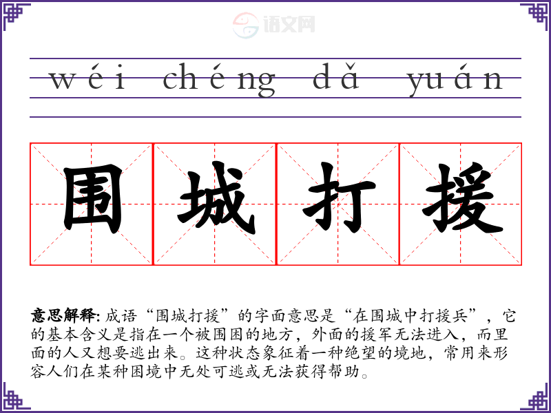 成语“围城打援”的字面意思是“在围城中打援兵”,它的基本含义是指在一个被围困的地方,外面的援军无法进入,而里面的人又想要逃出来。这种状态象征着一种绝望的境地,常用来形容人们在某种困境中无处可逃或无法获得帮助。