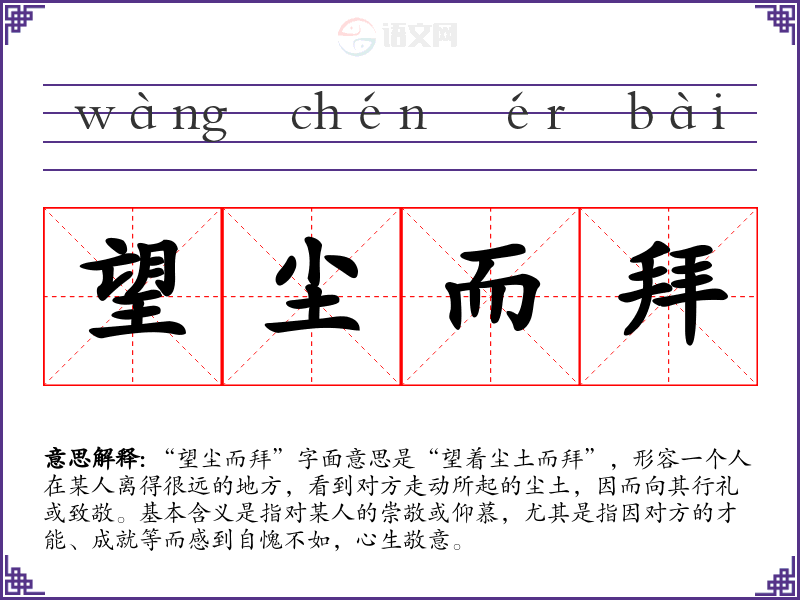 “望尘而拜”字面意思是“望着尘土而拜”,形容一个人在某人离得很远的地方,看到对方走动所起的尘土,因而向其行礼或致敬。基本含义是指对某人的崇敬或仰慕,尤其是指因对方的才能、成就等而感到自愧不如,心生敬意。