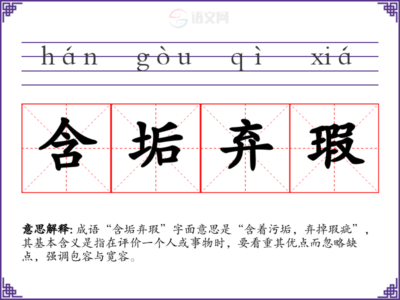 成语“含垢弃瑕”字面意思是“含着污垢,弃掉瑕疵”,其基本含义是指在评价一个人或事物时,要看重其优点而忽略缺点,强调包容与宽容。