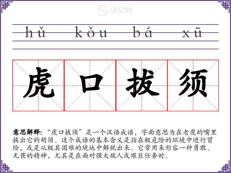 通过对“虎口拔须”的学,我深刻理解到在生活中,面对困难时保持勇气的重要性。这不仅丰富了我的语言表达,也让我在面对挑战时更加自信。这种成语的学帮助我领悟到,勇气和决心在成功路上不可或缺的价值。