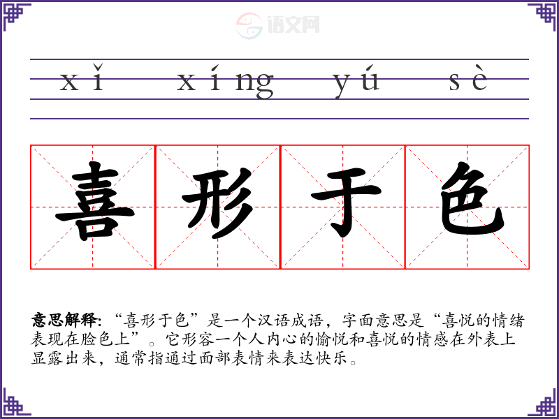 “喜形于色”是一个汉语成语,字面意思是“喜悦的情绪表现在脸色上”。它形容一个人内心的愉悦和喜悦的情感在外表上显露出来,通常指通过面部表情来表达快乐。