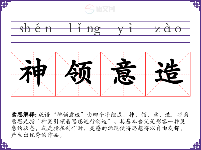 成语“神领意造”由四个字组成:神、领、意、造。字面意思是指“神灵引领着思想进行创造”。其基本含义是形容一种灵感的状态,或是指在创作时,灵感的涌现使得思想得以自由发挥,产生出优秀的作品。