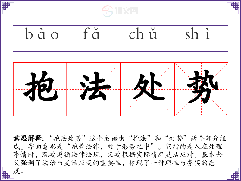 “抱法处势”这个成语由“抱法”和“处势”两个部分组成。字面意思是“抱着法律,处于形势之中”。它指的是人在处理事情时,既要遵循法律法规,又要根据实际情况灵活应对。基本含义强调了法治与灵活应变的重要性,体现了一种理性与务实的态度。